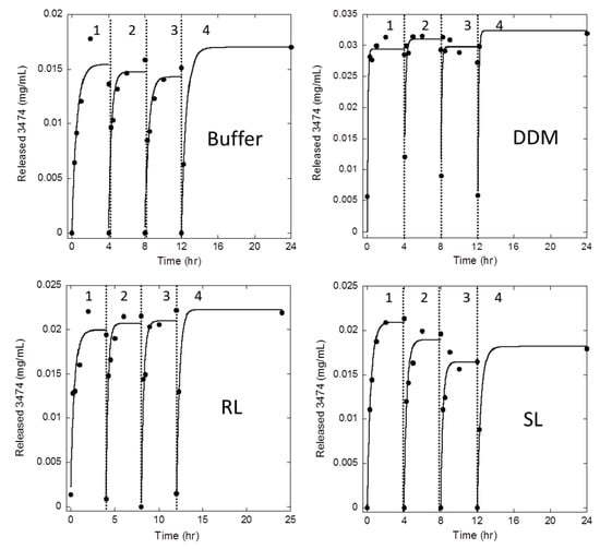 Soluble 3474 is released at the same final level in consecutive release cycles from each type of aggregate. The 3474 aggregates were prepared in the buffer, 10 mM DDM, 10 mM RL, or 10 mM SL and spun down. In each cycle, the aggregate was washed and resuspended in a PBS solution to 1 mg/mL and samples were withdrawn at different time points and centrifuged separately to measure the release of soluble 3474 over time. At the end of each cycle, the aggregate was spun down, and subsequently resuspended in a new cycle. The release of 3474 from different aggregates could all be fitted to a single exponential decay with half-lives of 14–18 min, except for DDM aggregates which reached equilibrium within the first measurement point (see main text). Release figures show release levels in mg/mL from a suspension of originally 1 mg/mL aggregate. Thus, the release figures in mg/mL also correspond to the fraction of release (disregarding the small reduction in total protein after each cycle).