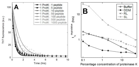 Finally, we investigated peptide aggregate stability by a simple protease assay, in which the broad-specificity proteinase K (protK) was incubated with peptide aggregates at protK–peptide molar ratios ranging from 1:1 to 1:1000, while following the change in ThT fluorescence over time (data for DDM shown in Figure 4A). The 3474 aggregated in the buffer, DDM, and RL displayed rapid degradation as a decay in the ThT fluorescence, reaching zero fluorescence after 2–20 h. The decay in ThT fit an exponential decay function satisfactorily, yielding a half-life t½.
