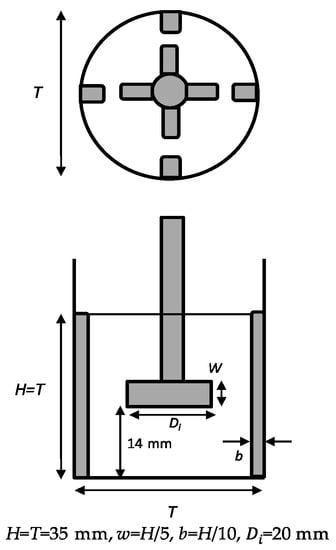 The coagulation experiments were performed in a stirred vessel (30 mL, made by central workshop of Tsukuba University, Tsukuba, Japan) containing four baffles and equipped with a four-paddle impeller, as shown in Figure 2. Fluid motion is induced by the rotation of the impeller, which rotates at a constant angular velocity. If the kinetic energy provided by the rotating impeller is assumed to be balanced by the energy dissipated in the fluid, the value of ε can be estimated from the following equation: