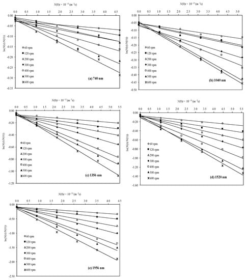 The measured values of ln (N(t)/N(0)) are plotted against t × N(0) for the different rotational speeds and particle diameters in Figure 4a–e. As can be seen from these figures, the relation between ln N(t) and t was linear for each run. Assuming the simple additivity of the perikinetics and the orthokinetics, we can subtract the contribution of the Brownian flocculation from the slope of the relation between l n   ( N ( t ) / N ( 0 ) ) and t while assuming its value to be 0.5 × 4kT/3μ and obtain the rate of orthokinetic coagulation for each condition. The value of 0.5 was taken based on the results of a previous experimental study [7,20]. The fact that the relation was linear confirmed the suitability of Equation (6) for evaluating the effect of the turbulent mixing intensity on the coagulation rate. Further, the obtained results confirmed that a higher rotation speed causes more frequent collisions between the particles and hence increases the coagulation rate [6,22]. A comparison with the rate of coagulation in the case of an end-over-end mixing device [7,20,21] indicated that the mixing intensity for the end-over-end rotation corresponds to the case with a rotation speed of 390 rpm in terms of the frequency of collisions between the colloidal particles.