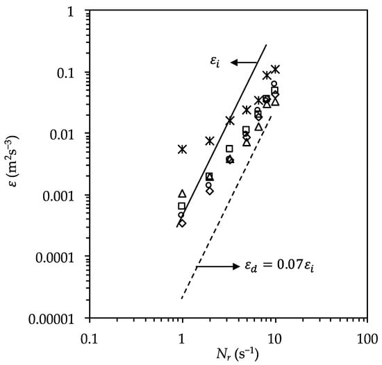 Assuming a value of 1.0 × 10−21 J for the Hamaker constant, ε was calculated from the data shown in Figure 5 using Equations (5) and (6). The calculation results are plotted in Figure 6 as functions of the rotation speed ( N r ). The calculated data principally lie between the solid and dashed lines. The solid line represents the values calculated from the measured torque using Equation (11). The result obtained in our previous experiment using latex particle of 1.0 μm PSL particle and 2L mixing vessel equipped with four baffles and a Rushton-type impellor exactly corresponds to this line [22]. On the other hand, the dashed line is drawn assuming 7% of ε i is used for collision [7], which is the result of the rate of coagulation in the end-over-end mixing device [7,35,36]. In the low-mixing-intensity region, the curve for the plotted data bends upward. This tendency becomes more prominent for smaller particle diameters and reflects the contribution of the coupling effect, which enhances the rate of coagulation [16,17,18,20,30,31,32]. For higher mixing intensities, the plotted data curves are parallel to the curve for the energy input determined using the torque meter. The absolute value of the amount of energy dissipated per unit mass used for coagulation in the case of the higher mixing intensities is lower than the energy input, but higher than the energy dissipated per unit mass in the case of the end-over-end mixing device, which is represented by the dashed line. This result implies that, with a decrease in the diameter of the mixing vessel, the energy dissipated per unit mass, which is obtained from the rate of coagulation, will decrease. However, to confirm this trend, a more systematic study using mixing devices with similar geometries but different dimensions is required.