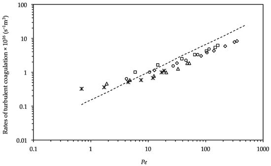 In order to elucidate the contribution of the coupling effect in the case of small Peclet numbers and the wall effect in the case of intermediate Peclet numbers, we replotted all the data for the rate of coagulation in Figure 5 as a function of the Peclet number in Figure 7. We theoretically determined the rate of coagulation as a function of the Peclet number, which is represented by the dashed line, using Equations (1) and (2). From the figure, one can easily recognize that for the region of higher Peclet number, c.a. Pe > 50, the slope of the plot converges to the theoretical value of 0.82 (= 1 – 0.18). However, for smaller Peclet number region, the rate of coagulation is higher than that predicted theoretically. The upward bending of the curve can be attributed to the contribution of the coupling effect, which enhances the coagulation rate. On the other hand, for higher Peclet numbers, the rate of coagulation decreased, owing to the wall effect. The wall effect ensures that the distribution of the dissipated energy is uneven in the small stirred vessel for low Reynold numbers [6,36,37,38]. Consequently, the rate of coagulation decreases owing to the wall effect. The same result was also obtained in a previous study [39]. However, when high Reynold numbers and a large stirred vessel were used by Kobayashi et al. [22], the wall effect was not detected. This is the reason they observed that the energy input and the energy used for coagulation are equal (i.e., ε i = ε d ).