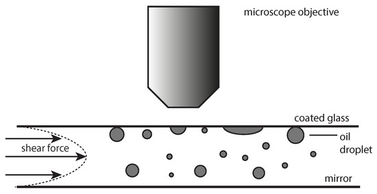 To measure the adhesion of oil droplets in the emulsion to the model cellulose surface, a flow cell setup was used. This flow cell has been used before in our previous work [18]. The emulsion is fed into the flow chamber by a pulseless pump, and the droplets are observed by placing the flow cell under a microscope (Figure 1). A detailed desciption of the flow cell, flow cell operation and image analysis can be found in [18].