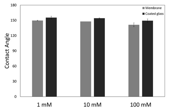 The contact angle measurements were performed in captive bubble mode, in which a droplet of oil is injected under the surface of interest. In this configuration, a large contact angle indicates a hydrophilic surface and a small contact angle a hydrophobic surface. The measured contact angles of the cellulose coated glass model surfaces and the membrane surfaces for 1, 10 and 100 mM NaCl are shown in Figure 3. On the membrane, the contact angle is 150 ± 1 for 1 mM NaCl, 148 ± 1 for 10 mM NaCl and 141 ± 4 for 100 mM NaCl. On the glass, the contact angles are 155 ± 3, 154 ± 1 and 148 ± 3 for 1, 10 and 100 mM respectively. All measured contact angles are above 140, which indicates the surfaces are all hydrophilic [21]. This is to be expected, because cellulose has hydrophilic OH groups. Even after 10 min of contact time with the surface, the droplet displayed a stable contact angle. The contact angles measured on the membrane is in all cases about 5 degrees lower than the contact angles measured on the cellulose model surface. This might indicate that the membrane surface is more hydrophobic, but is more likely due to higher surface roughness and air pockets trapped in the membrane pores [22]. At increasing ionic strength, there seems to be a very small decrease of the contact angle on both surfaces, indicating a tiny increase in hydrophobic interactions. The cellulose surface will be slightly negatively charged due to dissociation of surface OH groups, while the droplets are also negatively charged because of the anionic surfactant. At higher salt concentrations the repulsion between droplet and surface is decreasing, allowing a small decrease in contact angle.