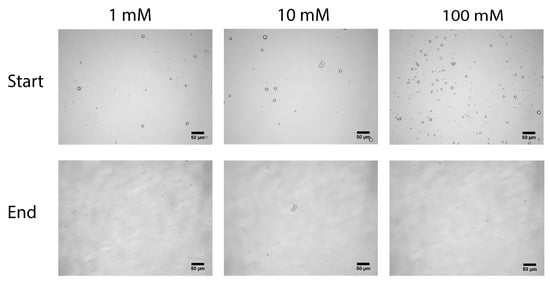 Images of the cellulose coated glass with attached droplets in the flow cell at 1, 10 and 100 mM NaCl and 463 mg/L SDS. The Start images were taken after flushing of the flow cell at the lowest possible speed, the End images were taken after the maximum shear force was applied.