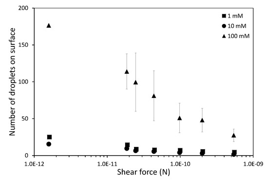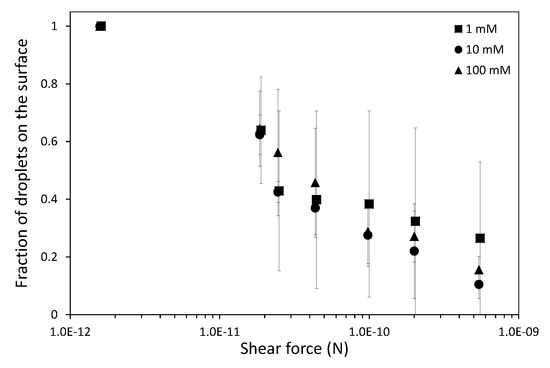 The fraction of droplets attached to the surface as a function of shear force is plotted in Figure 6. The fraction of droplets adhered tot the surface with applied shear force is comparable for the three different salt concentrations. This means that the force required to wash away droplets from the surface does not change significantly with an increasing salt concentration, in line with the rather constant contact angle of these droplets (Figure 3). These observations are however quite different from the effect of ionic strength observed for the adhesion of SDS stabilized emulsion droplets to a strongly negative hydrophilic surface (glass) and a hydrophobic surface [18]. For both surfaces a higher ionic strength was found to lead to a stronger adhesion. For these surfaces, charge, and thus the ionic strength plays a much more significant role. A glass surface is strongly negatively charged (at the studied pH), while also the hydrophobic surface obtains a strong negative charge due to the adsorption of surfactant. At higher salt concentration, charge repulsion between the negatively charged droplet and the negatively charged surfaces is screened, allowing stronger adhesion forces. For cellulose, only weakly charged and too hydrophilic to facilitate surfactant adsorption, this effect is not present and a relatively constant adhesion force is observed. The force of adhesion for the three different salt concentrations is thus quite constant for our weakly negative hydrophilic surface. When we look at the absolute number of droplets adhered to the model surface, however, we do observe a difference (Figure 7). At a salt concentration of 1 and 10 mM, only a few oil droplets adhere to the surface (see also Figure 5). At a salt concentration of 100 mM however, significantly more droplets adhere to the surface. At the end of the experiment, at maximum shear force, the largest number of droplets adhere to the surface at the highest salt concentration. The initial adhesion phase, when the fluid in the cell is stagnant, determines the amount of droplets that adhere to the surface. At 1 and 10 mM NaCl, the repulsive force between the slightly negatively charged cellulose surface and the negatively charged oil droplets is just sufficient to act as a kinetic barrier, decreasing the rate at which droplets adhere. At 100 mM however, due to electrostatic screening the repulsion between the droplets and the surface is slightly less, allowing the droplets to approach the surface more easily. This increases the chance for adhesion, and therefore the number of droplets that stick to the surface.