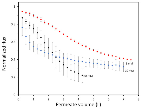 Normalized membrane flux as a function of the permeated volume for different concentrations of NaCl and 463 mg/L SDS. 48 kg/h TMP = 1 bar.