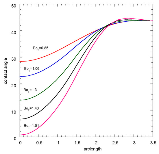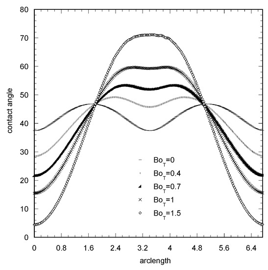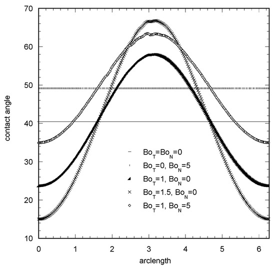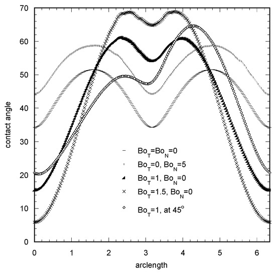 The proposed approach will be used here to derive the contact angle distribution evolution as the tangential force increases. A droplet with V = 0.6 in the absence of forces is considered at the beginning. The droplet shape is spherical cap and the contact angle is uniform with φ = 36°. Then, the tangential force starts to increase. The contact angle is a function of the position along the contact line with the maximum towards the force direction and the minimum at the opposite direction. This profile has a simple cosine shape and continues to evolve up to the point that the maximum angle reaches the advancing contact angle φA (φA = 44° is assumed here). Then, spreading begins and the contact line shape becomes a function of the tangential force BoT. This shape is completely parameterized through Equation (6), and the evolution problem is transformed to seeking of the b value that leads, through the procedure described in Appendix B, to a maximum contact angle equal to φA. For each value of BoT, the Newton–Raphson method is used to find b. In this way, the evolution of contact angle distribution is computed up to the case of the minimum angle being equal to the receding angle φR where sliding begins. The computed angle distributions along the contact line are presented in Figure 5. It is noted that a non-physical (but slight) overshoot of the contact angle appears close to the front edge of the droplet. However, this overshoot appears only for rear angles closer than 5°, so, in principle, the acquired profiles can be considered as acceptable. In that case, the consideration of a specific contact line shape is equivalent to the development of a contact line evolution model. The corresponding contact line shapes are shown in Figure 6.