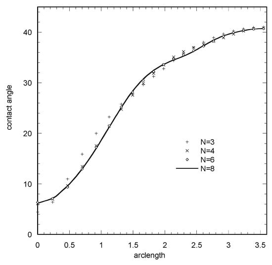 The application of the method shown in Appendix B for the above profile with b = 0.5 (very distorted contact line) and for BoT = −1 and V = 0.6 for increasing values of N leads to the distribution of the contact angle along the contact line, as shown in Figure 4. The negative tangential bond number means that the tangential force is applied to the opposite direction than the one having created the distortion of the contact line. The convergence study is presented for a negative Bond number because it corresponds to more stringent conditions. It is evident that complete convergence has been achieved at N = 6. Furthermore, to the convergence analysis, the resulting angle distribution is compared to the one resulting from the finite element solution with a fine grid, and coincidence is found. Figure 4 suggests that even for N = 4, an accepted angle distribution can be derived. It is noted that the above situation holds for a relatively distorted contact line with b = 0.5. The required number N for convergence decreases as b decreases. Another issue is that the convergence test is performed against the contact angle, which is a measure based on the derivative of the droplet shape. Such a convergence test is stringent. A convergence test against the droplet shape itself leads to the very interesting result, in that in any case the expansion with N = 3 terms describes accurately the shape of the droplet. For comparison purposes, the number of unknown variables in the finite element technique is several hundreds and in surface evolver is several thousands. The important advantage of the proposed technique is that it offers a simple closed form representation of the droplet shape. This information can be utilized (i) for the reconstruction of the droplet shape from experimental limited image information and (ii) for the derivation of low-order weighted residual methods for the solution of the non-linear Young–Laplace equation. It is noted that the above discussion holds for homogeneous surfaces (at the scale of the contact line, i.e., a scale higher than the microscale). Localized heterogeneities in this scale can create high frequency perturbations to the contact line profile and dramatically increase the number of terms in the eigenfunction expansion needed for the contact line description. In this way, the stability of the solution technique is adversely affected.