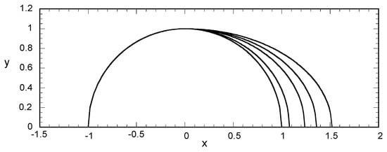 (3) Elliptical basis arising from tangential force to the drop. In this case, we assume an elliptical basis which is not due to deposition pinning but due to applied tangential force. An elliptical shape typical for this case (e.g., see [13,18]) with a = 0.96 and b = 1.2 is considered. An attempt to directly compare with the results of [13] failed, since it is not possible to identify what is used as an equivalent drop diameter in the definition of Bond number in [13]. Thus, an arbitrary characteristic length is considered for the purpose of analyzing the resulting contact angle profiles. These profiles in a case of zero normal force and for increasing tangential force are shown in Figure 3.