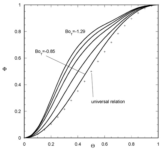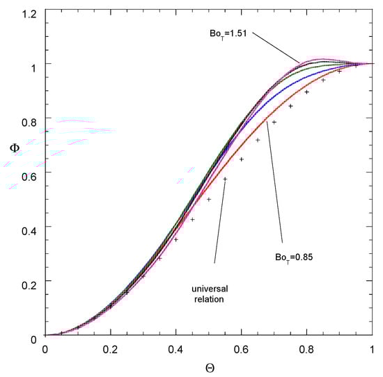 The contact angle distribution evolution in terms of normalized variables is shown in Figure 7. It is obvious that the normalized contact angle distribution tends to a self-similar shape as the tangential Bond number increases. In the case of the initial contact angle being equal to the advancing one, the convergence to self-similarity confirms the universality proposal in [13] converging at a faster rate. However, the resulting distribution is far from the universal one suggested in [13], which takes the form Φ = 2(1 − Θ)3 − 3(1 − Θ)2 + 1 and also appears in Figure 7. The universal shape adequately represents the actual distribution close to the two edges of the droplet, but there is a deviation in intermediate regions (especially in the elliptic part of the contact line). The universal shape is antisymmetric with respect to Θ = ½, which is a rather improbable behavior in light of the present results.