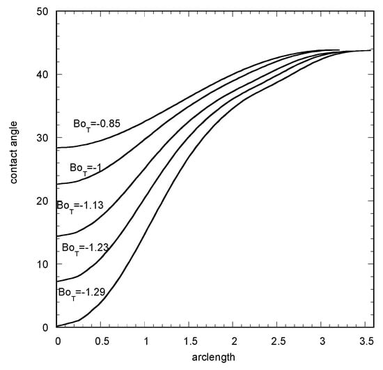 In order to demonstrate the versatility of the solution method and to shed more physical insight on the problem, the contact angle profiles at the contact line shown in Figure 6 at the inception of spreading but with a force applying to the opposite direction are shown in Figure 8. The corresponding normalized results are presented in Figure 9. The spreading now starts for smaller (in absolute value) Bond numbers, as it is affected by the deformed contact line. It is noted than an elbow appears in the contact angle curve as the contact line deformation increases. The location of this elbow is at the position of transition of the contact line shape from circle to ellipsis. For larger BoT numbers, the evolution is mainly due to the increase of this elbow. In any case, universality does not appear in these curves. The presented example refers to conditions with no strict actual linearity but similar results for the normalized variables are taken for lower values of θA.