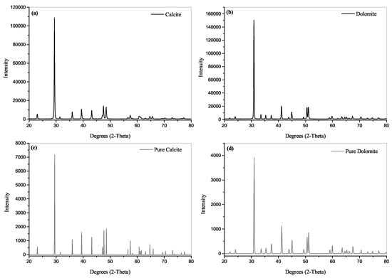 X-ray diffraction (XRD) patterns of the calcite (a) and dolomite (b) powders used in this study mapped with pure materials (c,d). Top: Samples employed in this work. Bottom: Reference data from literature [,].