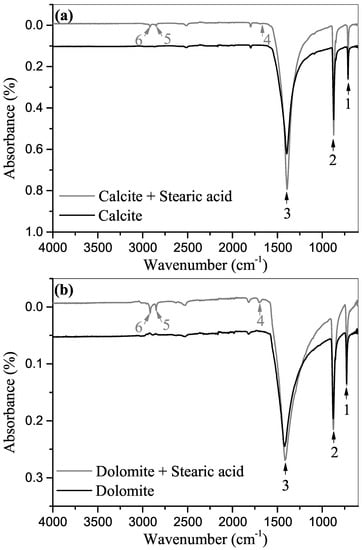 In order to examine the functional groups present on the carbonate surfaces, ATR-FTIR spectroscopy was performed in an ambient environment. Figure 2a presents IR spectra of the unconditioned calcite powder and samples conditioned with stearic acid, in which characteristic absorption bands, associated with carbonate groups, can be clearly identified. The bands, located at 712 cm (1) and 871 cm (2), are attributed to the symmetric and asymmetric C–O bending (deformation) vibrations, respectively. The broad band centred at 1407 cm (3) is associated with asymmetric C–O stretching and is one of the characteristic absorption bands of carbonate groups. These results are in agreement with previous FTIR spectroscopy of calcite [,,].