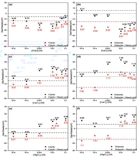 Comparison between the experimentally measured zeta potentials of unconditioned calcite and dolomite particles with the stearic acid-conditioned particles as a function of sodium chloride (a,b), calcium chloride (c,d), and magnesium chloride (e,f) aqueous electrolyte concentration. Measured pH values are reported above/below each point. Black dashed lines show zeta potential of the unconditioned carbonate particles in water and red dashed lines show zeta potential of stearic acid carbobate particles in water.