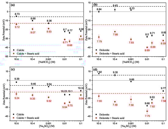 Comparison between the experimentally measured zeta potentials of unconditioned calcite and dolomite particles with the stearic acid-conditioned particles as a function of sodium bicarbonate (a,b), and sodium sulphate (c,d) aqueous electrolyte concentration. Measured pH values are reported above/below each point. Black dashed lines show zeta potential of the unconditioned carbonate particles in water and red dashed lines show zeta potential of stearic acid carbobate particles in water.