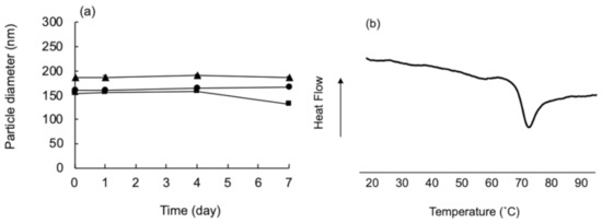 Characterization of mannosylerythritol lipid B (MEL-B) liposomes. (a) The change in particle diameter as measured by dynamic light scattering; (b) the thermotropic phase transitions as measured by differential scanning calorimetry (DSC). Symbol: circle, 100 nm; square, 200 nm; and triangle, 400 nm.
