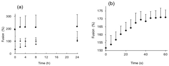 Fusion rate of stratum corneum lipid liposomes (SCLLs) with stratum corneum lipid liposomes, DMPC liposomes and MEL-B liposomes. (a) Results up to 24 h; (b) only MEL-B liposomes (60 s). Symbols: closed diamond, SCLLs/SCLLs; closed triangle, DMPC liposomes/SCLLs; closed square, MEL-B liposomes/SCLLs. Values are expressed as the mean ± S.D. of three experiments.