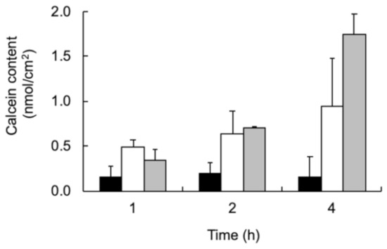 Calcein aqueous solution and MEL-B liposomes containing calcein were applied to hairless mouse skin for 1, 2 and 4 h prior to measuring the concentration of calcein in the skin (Figure 3). Compared to the application of the calcein aqueous solution, the application of MEL-B liposomes containing calcein resulted in a greater increase in calcein concentration in the skin. In addition, a greater increase was observed with the application of 1.0% MEL-B liposomes than with the application of 0.5% MEL-B liposomes.