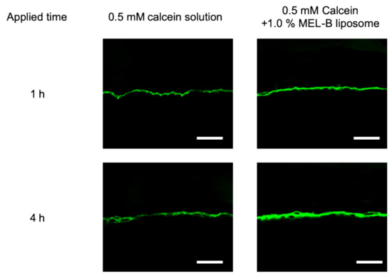 We measured the skin permeation of calcein at 24 h after application (Figure 5). Compared to the application of calcein aqueous solution, the application of MEL-B liposomes containing calcein resulted in greater increases in calcein permeation. In addition, the application of 1.0% MEL-B liposomes resulted in a greater increase in permeation than the application of 0.5% MEL-B liposomes.