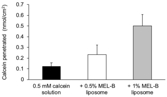 Following the skin permeation experiment, we measured the calcein skin permeation volume at 24 h. Compared to the application of calcein aqueous solution, applying the MEL-B liposomes containing calcein resulted in an increase in the transmitted concentration of calcein (Figure 5). These results suggest that applying calcein together with MEL-B liposomes results in an interaction with intercellular lipids to achieve a high degree of distribution within the stratum corneum; this in turn results in an increased volume of calcein being transmitted through the skin.
