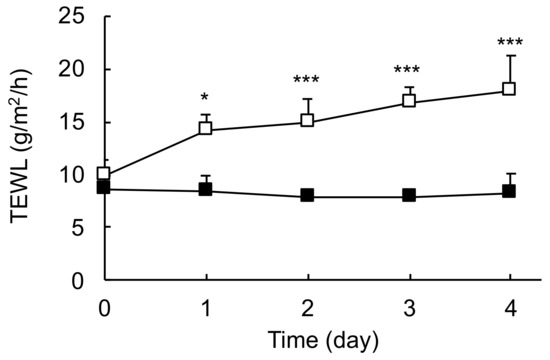 Change in TEWL after the application of MEL-B liposomes and SDS solution. Symbols: closed square, 1% MEL-B liposomes; open square, 1% SDS solution. Values are presented as the mean ± S.D. of three experiments. * p < 0.05, *** p < 0.001 using a Student’s t-test.