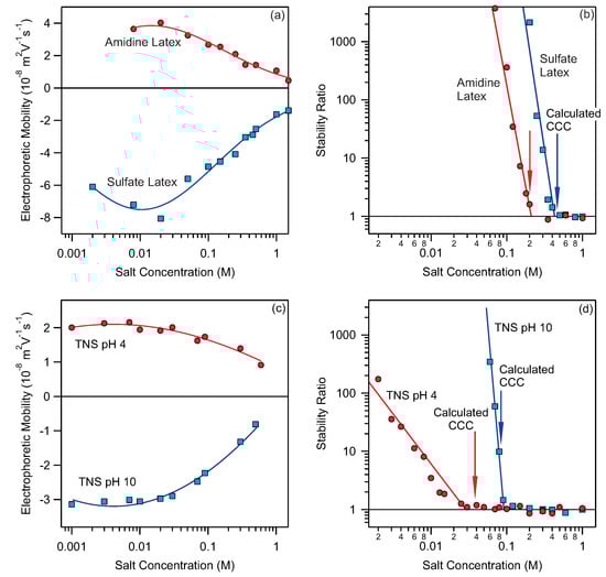 In Figure 1c,d results for titania nanosheets at two different pH are shown [49]. These particles are postively charged at pH 4.0 and negatively charged at pH 10. Again the calculated CCCs marked with arrows in Figure 1d match perfectly the experimental data. The examples shown in Figure 1 confirm that our method for calculating CCCs gives good results for positively and negatively charged as well as organic and inorganic particles in the presence of simple monovalent electrolytes.