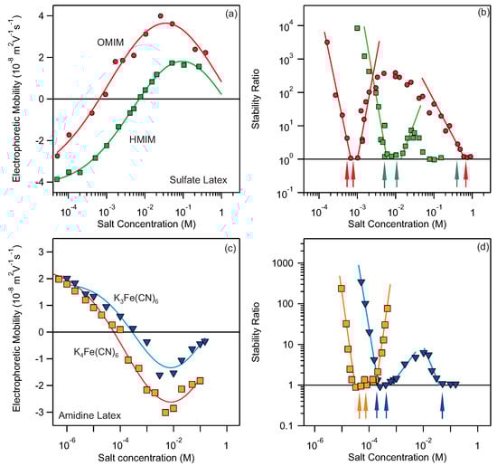 The particles are negatively charged at low concentrations and undergo charge-reversal at increased concentrations. This strong adsorption of imidazolium based ions is reflected also in stability of suspensions; see Figure 2b. The particles are stable at low concentration and aggregate fast close to charge-neutralization point after which they re-stabilize due to overcharging and finally become unstable again at high salt levels. This behavior gives rise to three CCCs. Our method can predict three CCCs for each salt and they are marked with red and green arrows, respectively. Similarly, the charge reversal is observed for amidine latex particles in the presence of Fe(CN) and Fe(CN) multivalent anions; see Figure 2c. Again multiple CCCs are present and can be predicted relatively accurately with the proposed method (see positions of the arrows in Figure 2d). However, the accuracy of predictions for strongly adsorbing ions is in some cases lower. For example, in the case of HMIMCl the third CCC is predicted at mM while it is observed below 100 mM. These deviations are probably related to non-DLVO interactions, which are not taken into account in our simple method, however they have been shown to be important in similar systems [50,51,52]. Albeit some inaccuracies, our proposed method for calculating CCCs is still able to quantitatively predict CCCs in most cases.
