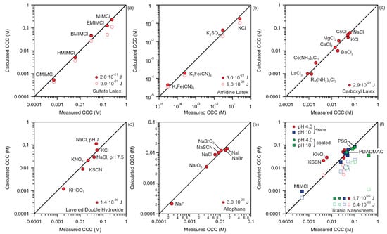 This analysis enables us to judge the quantitative accuracy of the proposed method. The results for different types of organic and inorganic particles as well as spherical and layered materials are shown. For each system CCCs resulting from the aggregation induced by different ions are shown. All the calculations for a specific system are done with one value for Hamaker constant. These Hamaker constants need to be adjusted because theoretical values of Hamaker constants are either not known or they can overestimate the magnitude of the van der Waals force. The Hamaker constants used for polystyrene latex particles shown in Figure 3a–c are between 2 and J. These values are in agreement with typical values for latex particles in aqueous solutions extracted from direct force measurements [51,52,53]. Note that however, the measured values are substantially lower as compared to the theoretical value for polystyrene latex calculated from the Liftsitz theory, which is equal to J [53]. These deviations between the measured and calculated Hamaker constants can be explained by the surface roughness of the particles used in the experiments [53,54,55]. Therefore, the use of theoretical values of the Hamaker constants for calculation of CCCs leads to underestimation of CCCs; see Figure 3a,b,f. This procedure of adjusting the Hamaker constants for a given material therefore enables the determination of the effective Hamaker constant for the system at hand.
