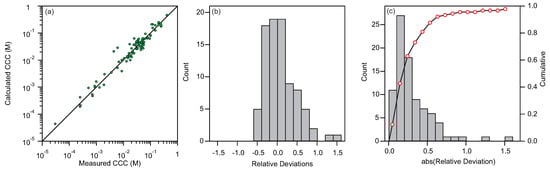 Deviations of calculated and experimental CCCs. (a) Comparison of calculated and measured CCCs for all samples. (b) Distribution of relative deviations between calculated and measured CCCs. (c) Distribution of absolute values of relative deviations between calculated and measured CCCs shown with bars with scale on the left side. The points show the cumulative of the distribution with scale on the right side.