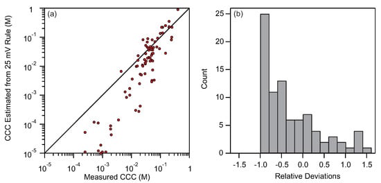 (a) Deviations of CCC estimated using the 25 mV rule and experimental CCCs. (b) Distribution of relative deviations between estimated CCCs using the 25 mV rule and measured CCCs.