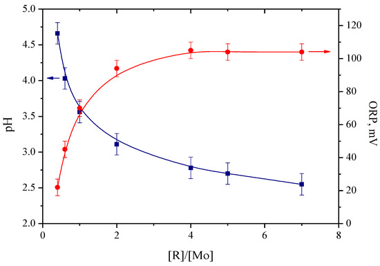 As can be seen from the above curves, an increase in the molar ratio [R]/[Mo] from 0.4 to 4.0 leads to the expected increase in the redox potential, with maximum value reaching about 100 mV. In this case, ORP is mainly a characteristic of the ascorbic acid/dehydroascorbic acid pair. The redox potential remained constant at [R]/[Mo] > 4. On the other hand, pH value continues to decrease owing to the increase in the concentration of ascorbic acid. The minimum pH value of 2.5 recorded corresponds to [R]/[Mo] = 7.