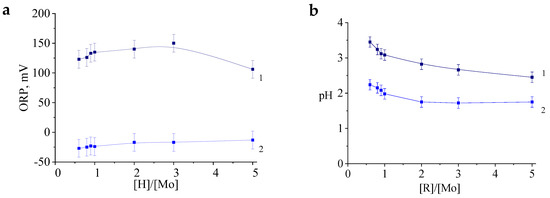 The values of the redox potential (a) and pH (b) of the samples at different molar ratios [R]/[Mo] immediately after mixing the reagents (1) and the next day (2).
