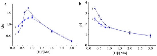 As can be seen from the presented plots (Figure 7a), the maximum concentration of particles was determined within the range of molar ratios [H]/[Mo] of 0.5–1.5. Over time, the samples synthesized at [H]/[Mo] ≤ 1 showed a decrease in absorbance. For the same samples, a drop in pH values is obvious.