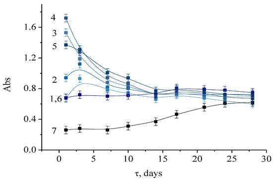 Over time, sedimentation was observed in samples with a high concentration of ascorbic acid ([R]/[Mo] > 1.0). To track how the concentration of particles changes over time after their formation, the absorbance of the samples at the maximum (750 nm) was used.