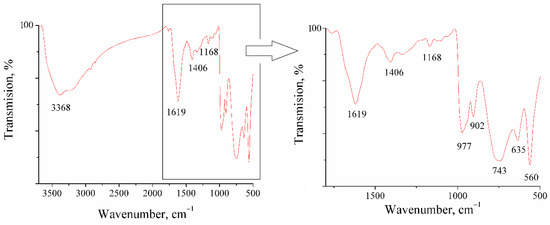 The region below 1000 cm−1 contains bands related to vibrations of the polyoxomolybdate framework. In the range of 950–990 cm−1, closely spaced poorly resolvable bands are observed, which are related to the Mo=O bond. A band of 977 cm−1, corresponding to stretching vibrations of the Mo-O-Mo bond [30,31,32], is also presented in this region.