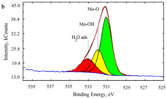 The oxygen spectrum was divided into three lines with binding energies of 531.0, 532.4, and 533.6 eV, which correspond to the bond lengths of Mo-O, Mo-OH, and oxygen in the composition of adsorbed water H2Oads. The data obtained are in good agreement with the results of studies of the structure of molybdenum clusters published in the literature [38,39,40].
