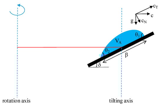 Up to now, experimental studies on forced spreading refer to one of two effects: either to simple tilting plates or to centrifugal devices with varying tangential force applied to a droplet lying horizontally. Hence, theoretical studies also refer to similar conditions [4,5,6]. The generalized simultaneous variation of both effects requires new theoretical analysis. Earlier [18], an oversimplified model for the drop shape was introduced. It is based on the combination of a two-dimensional (planar) geometry and linearization of the Young–Laplace equation. Such a model is expected to give only qualitative information but it has the major advantage that it permits analytical solution retaining the essential physics of the process. In that earlier work, the model has been developed and results are presented for the case of only normal or only tangential force. Here, it is expanded for arbitrary variation of both forces and results are presented for both idealized and realistic variation scenarios. The reference set up considered for the theoretical analysis consists of a droplet lying on a plate which can be rotated and tilted simultaneously, as displayed in Figure 1. The ratio of droplet size to the distance from the rotation axis is so small that the exercised body force can be assumed uniform along the droplet.