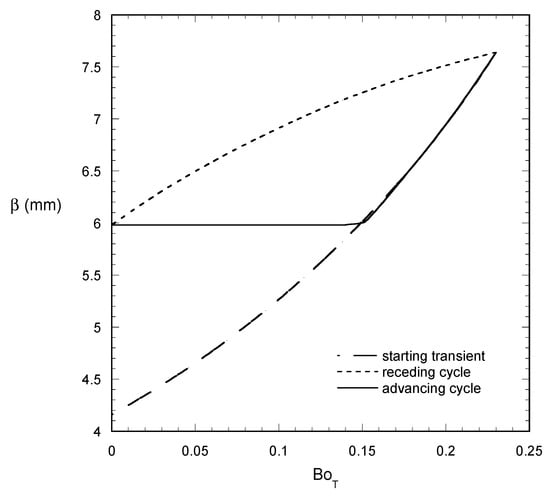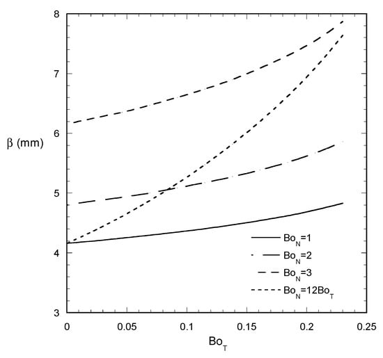 A more interesting scenario is the simultaneous increase of both force components (in the case of absence of gravity it corresponds to increasing the rotation speed at a fixed tilting angle). Considering exactly the same set of parameters as for a constant normal force plus the relation of BoN = 12 BoT, very interesting results are obtained. At the starting transient the droplet length increases crossing the lines of constant BoN (Figure 2). Under the particular conditions of the transient, a function β(ΒοΝ,ΒοΤ) can be constructed which can give directly β for arbitrary BoN–BoT trajectory. The idea behind the proposed scenarios is not the direct imitation of practical situations but the allowance to understand better the droplet shape evolution process in order to create models for any practical situation.