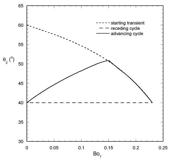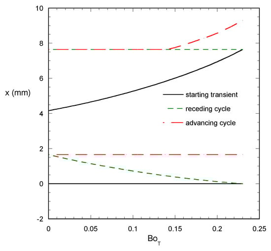 Typical droplet profiles that correspond to the results shown in Figure 3, Figure 4 and Figure 5 are presented in Figure 6 for periodic forcing and BoN = 12 BoT. It must be noted that for clarity in the presentation the scales at the two axes are different leading to distorted views of the droplet profiles. Figure 6a refers to the starting transient. As BoT increases, the symmetry is destroyed but also the length increases due to increase of BoN. The receding cycle profiles are shown in Figure 6b. The angle θ2 has the value θr at the beginning of the cycle. The reduction of tangential force leads to increase of the angle θ2, but the reduction of the normal force leads to its decrease which overall prevails leading to retraction of the rear contact line edge. Therefore, the rear contact line retraction is due to the reduction of the normal force. The front contact line does not retract due to the higher value of θ1 than θ2 in the beginning of the receding cycle. The cycle ends with a symmetric drop (zero tangential force) with angles at their receding values. The profiles for the advancing cycle are shown in Figure 6c. Initially, the droplet retains its length and both angles increase. At some point, the front angle reaches the advancing value, so the droplet length starts increasing and the rear angle starts decreasing. The front contact line edge moves leading, at the end of the cycle, to the same droplet shape as in the start of the cycle but at a different physical (spatial) position (see the x values of both edges). Such a behavior cannot be identified by the parameter variation appearing in Figure 3, Figure 4 and Figure 5. To better identify the situation, the variation of the physical position of the two contact line edges of the droplet during one cycle is presented in Figure 7. The region between the two lines in this figure (for each cycle) corresponds to the physical space occupied by the droplet. From this figure, it is clear how the droplet initially expands, then, when it gets in the oscillating regime, retracts and, finally, expands again but with a different fixed point. This motion pattern appears in each oscillation cycle leading to an effective overall droplet motion (shift by 1.66 mm per cycle) which is exclusively due to the simultaneous variation of BoN with BoT. The situation arising here has a very interesting sequence: The macroscopic motion of the drop cannot be identified as spreading (dominated by surface energy) or sliding (dominated by hydrodynamics) in case of complex force scenarios.