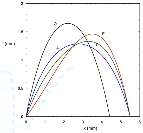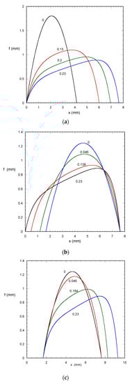 Let us first present what are the predictions of the model for some simple scenarios regarding the two forces. The case of a droplet with VA = 5 mm2, θa = 60° and θr = 40° with an increasing tangential force is examined. This case has been previously studied for zero normal force [18], so the effect of non-zero normal force is examined here. It is found that the main effect of the normal force is just to elongate the droplet with a negligible effect to the shape at the two edges. The normal force does not influence the critical Bond number BoTc and, thus, the critical detachment force which is compatible to the independency of force from the droplet size according to the present model (see Equation (19)). It is reminded that this independency refers only to two dimensions (extension to the third dimension leads to the proportionality of critical force to the droplet size appearing in the well-known Furmidge equation). The BoN is expected to affect the critical force for sliding in three dimensions through the droplet width dependence. Figure 2 shows the increase of droplet length as BoT increases for an initial angle θ0 equal to the advancing one. The evolution of the droplet profiles is quite similar to those for zero normal force [18]. In addition, introducing an oscillation of the tangential force (i.e., BoT varies periodically between 0 and BoTc), a similar periodic behavior of droplet shape is taken independently of the normal force. In particular, after the initial transient the droplet shape retains its length (taken at BoTc) and its two angles θ1 and θ2 oscillate following certain curves already found for BoN = 0 in a previous study (e.g., see [18] for details).