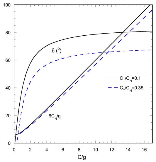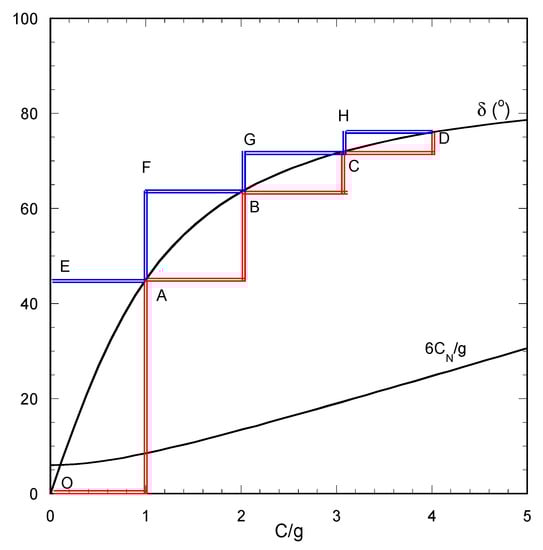 The required variation of δ with C for two values of the component ratio is shown in Figure 8. The general shape of the δ vs. C curve is similar to the case of zero CT. The normal acceleration component is also shown in the figure. The form of the function δ vs. C indicates that the required trajectory is technically quite difficult to be exactly followed. There is large sensitivity with respect to rotational speed for small speeds and with respect to the tilting angle for large speeds. In practice, the trajectory can be followed only in discrete steps which, even if they are small, they still create excess forces. The influence of these forces can be assessed employing the analytical droplet model. In order to demonstrate the procedure a very coarse (four steps) stepwise approximation of the continuous δ–C curve for zero tangential force is considered. There are two routes to achieve this: (i) first vary the tilting angle δ and then vary C (i.e., rotational velocity) in each step (blue line at the left of continuous curve in Figure 9) and (ii) first vary C and then vary δ (red line at the right of continuous curve in Figure 9). Computations show that the second route leads to larger tangential forces so droplet profiles are shown only for the first route. The same droplet parameters as before are considered except for θr which is assumed to be zero to avoid droplet sliding. It is also assumed that BoN = CN/2.5. Some profiles for specified positions along the blue route are shown in Figure 10.