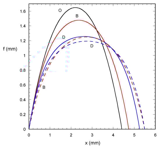 The comparison of droplet profiles at positions B and D reached through the continuous curve and through the left stepwise one (blue line in Figure 9) is presented in Figure 11. The difference between the two routes in position B (red curves) is very large since the droplet has been elongated abruptly by the tangential force raised by the stepwise route. As the normal force increases the droplet, the following continuous route is progressively elongated leading to small differences between the profiles from the two trajectories at position D. The above case study reveals the complexity of the problem combining the technical limitations on applied forces variation and the physicochemical aspect of droplet spreading. This is why the simple model presented herein is useful to assess different experimental procedures and as a starting point for more detailed calculations. A partially qualitative confirmation of the resulting behavior regarding the oscillations of tangential force and the force step scenarios can be found in [8].