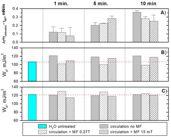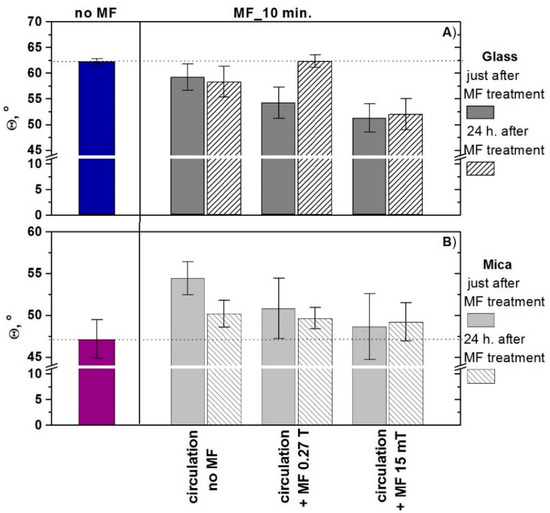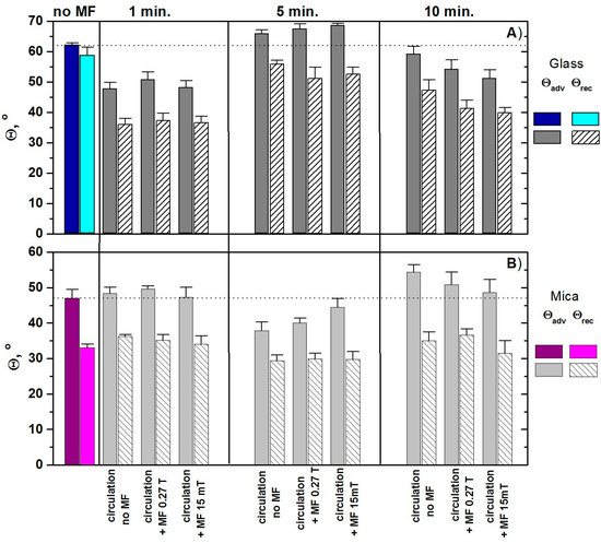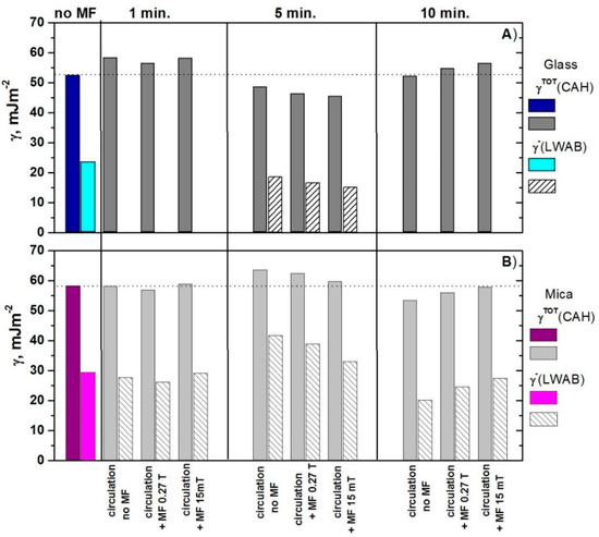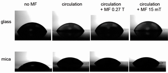 Comparing the advancing contact angles (Figure 1) and the values of apparent surface-free energy calculated from the water contact angle hysteresis (Figure 3), it can be seen that, if the duration of water treatment is extended to 5 and 10 min, the presence of MF enhances the effect caused by circulation for glass and weakens it for mica. For both surfaces, the effectiveness of the magnetic stack (15 mT) is greater than that of the single neodymium magnet (0.27 T). This can be related to a different arrangement and density of the field lines. In the case of shorter operating time (1 min), the presence of 0.15 mT MF enhances the effect caused by only the circulation if the contact angle was measured on the mica surface and weakens if on the glass surface. For 15 mT MF, the effect is reverse.
