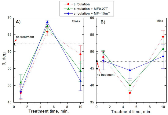 To depict the contact angle changes better, the changes in the water advancing contact angles on the examined surfaces are plotted in Figure 6. It can be seen that their values depend largely on the magnetic field duration with the maximum appearing for 5 min of MF operation. However, if these changes are compared with the water contact angle obtained for the untreated water (denoted as “no treatment”), they are no longer so clear, particularly for the glass surface. Nevertheless, it is evident that the changes are greater for the glass, whose surface is more hydrophobic than that of mica. This finding is in agreement with the results obtained by Ozeki et al. [31] who used static MF from 1 to 9.6 kG at 30 °C. They found that MF affected water adsorption at the surface coverage >1 regardless of the solid type. This indicates that the magnetic field acts on the water molecules interacting weakly via the hydrogen bonds than on the strongly adsorbed first layer. They also showed that MF can affect the first adsorbed layer of water molecules interacting with the hydrophobic surfaces. Otsuka and Ozeki [32] measured the magnetized and non-magnetized water contact angles on the Pt plate and found no changes for the de-aerated magnetically-treated water. If magnetically-treated water contained dissolved oxygen, the measured contact angle decreased from 65° to 56°.