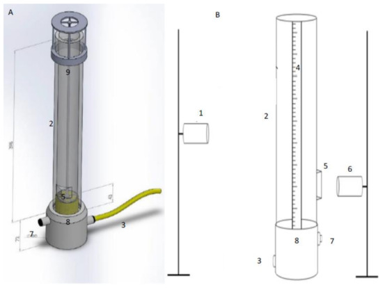 In Figure 1, the section labels are as follows: 1. the camera that is used to measure foam height, 2. the acrylic column, 3. gas inlet, 4. scale, 5. prism used to provide a flat interface to measure bubble diameter which is unaffected by the curvature of the column, 6. the camera used to measure the bubble diameter, 7. liquid outlet which is plugged during the experiment and is used to allow the easy drainage of the liquid out of the column, 8. where the capillaries and porous media is located, 9. the metal holder used to stop the porous media from being ejected from the column due to the pressure build-up beneath the media.
