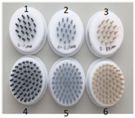 The foam column can be fitted with different sets of capillaries or with a porous material (for example, the sponges listed in Table 1). The porous materials listed in Table 1 were investigated previously [23] using an SEM device (Loughboroug Materials Characterisation Centre, Loughboroig, United Kingdom). The properties of the capillaries vary in radii size and arrangement. In Figure 2, three sets of capillaries are investigated in two types of arrangements. These are referred below as ‘small formation’ which is along the top row of Figure 2 and ‘large formation’ which is positioned along the bottom row.