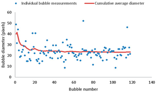 The bubble diameter of 118 bubbles along with the cumulative average, indicating that the minimum sample size that can be used is 50 bubbles.