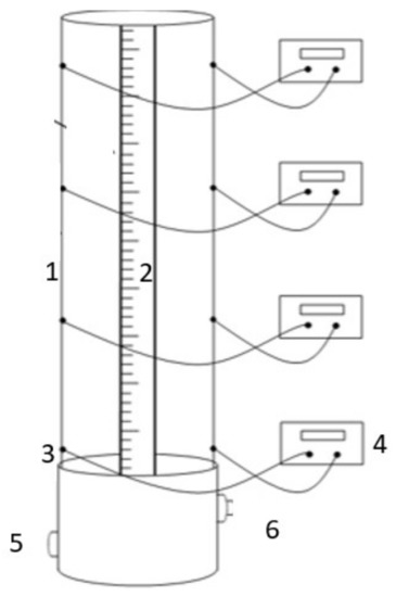 Schematic diagram of the homemade dynamic foam analyser, where the first ohm-meter is positioned close to the bottom and the other electrodes are positioned at 10 cm, 17.5 cm, and 32.5 cm above this point. 1. is the acrylic column, 2. scale, 3. electrodes which are located on each side of the column to allow the resistance and hence the conductivity across the foam to measured, 4. ohmmeter used to obtain the resistance across the foam, 5. gas inlet, and 6. liquid outlet which is plugged during the experiment and is used to allow the easy drainage of the liquid out of the column.