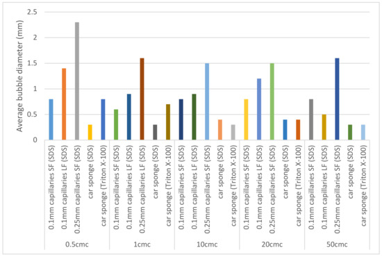 The bubble diameter of the foams produced on capillaries and the car sponge (properties which are shown in Table 1) with both SDS and TritonX-100 are shown in Figure 5.